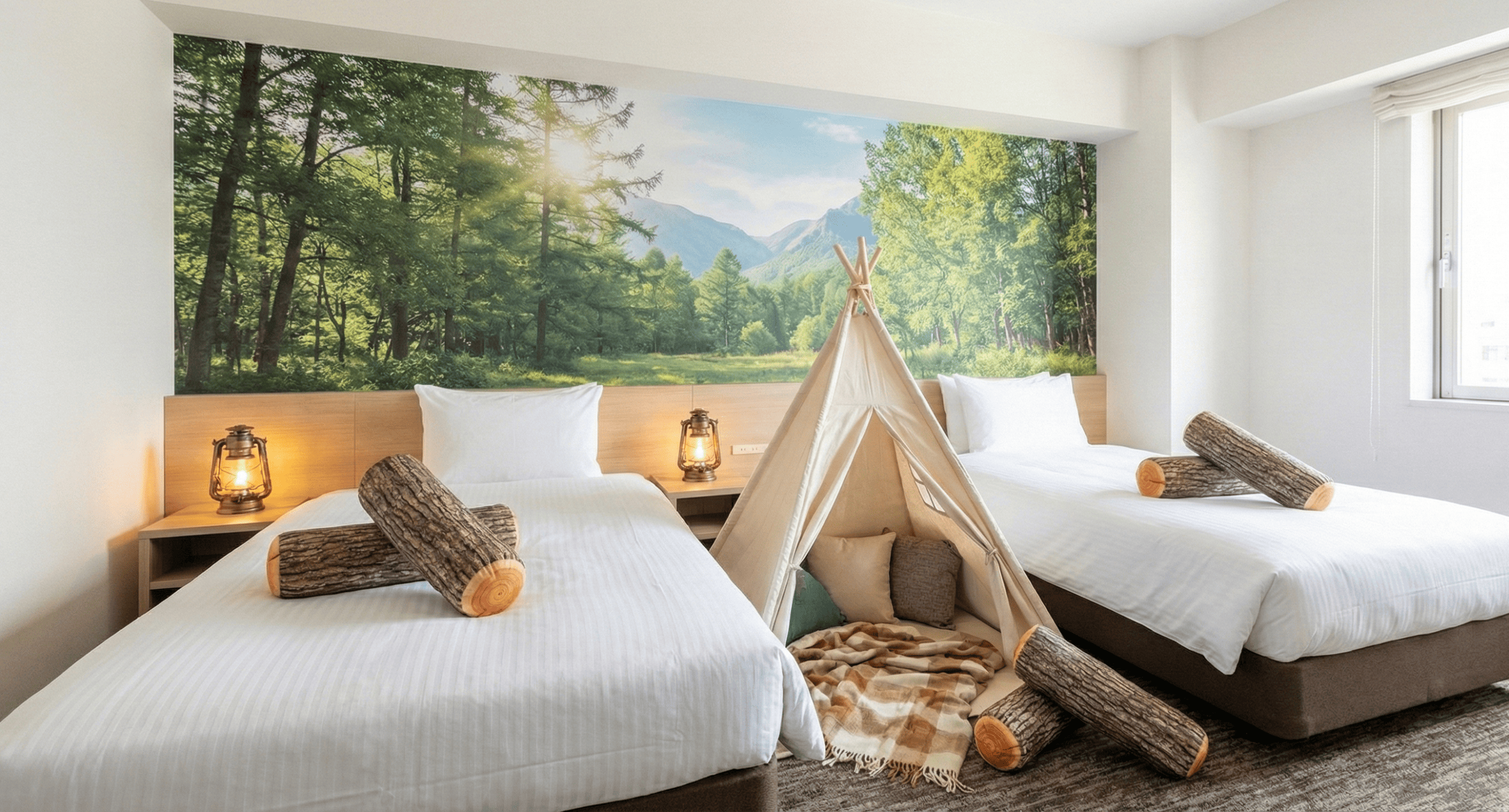扉を開ければ、そこは家族だけのキャンプ場。壁一面の森と山に囲まれて、室内なのにアウトドア気分を満喫。天候や虫の心配もなく、小さなお子様でも安全に冒険を楽しめます。