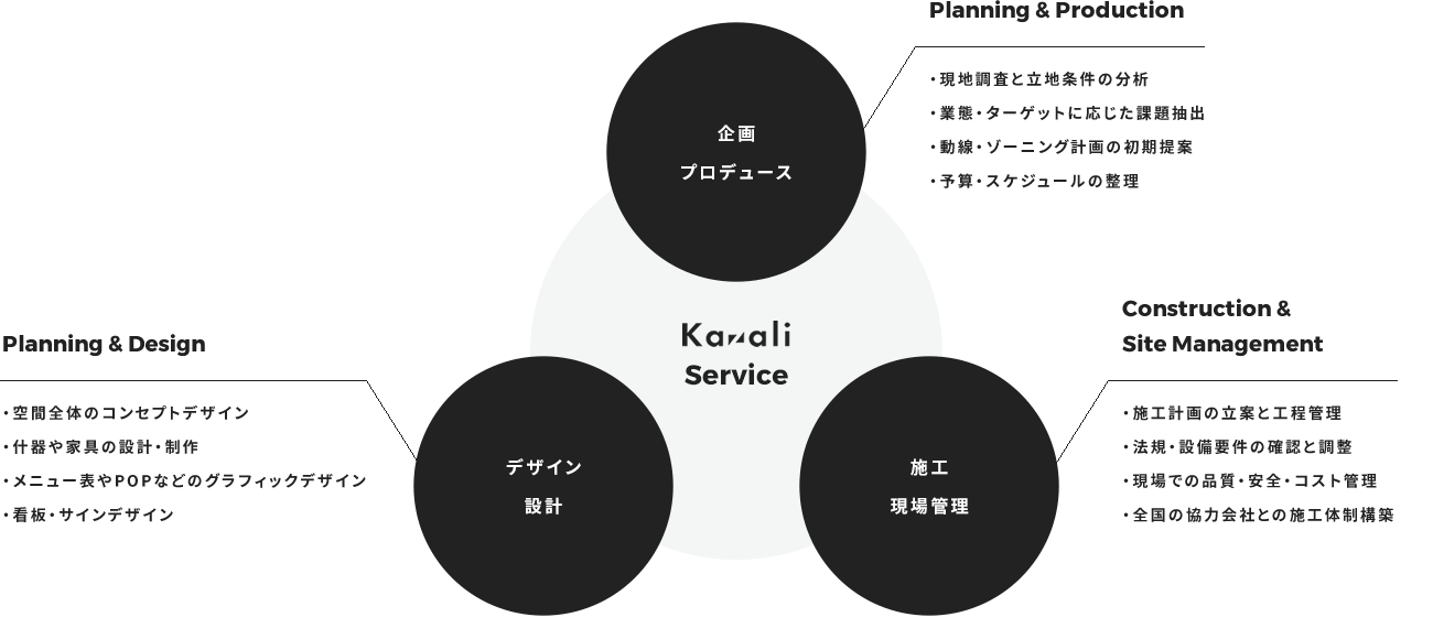 Kazaliの特徴は、企画段階からデザイン設計、施工・現場管理までを一貫して担うことができる点です。立地や商圏の特性、開業後の運用面までを見据えたご提案を行います。